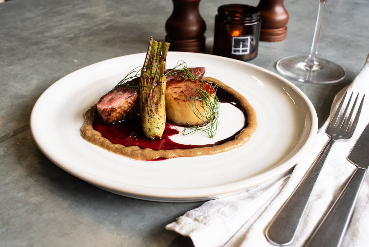 with porcini Puree, baby fennel, cherry, fennel cress, potato fondant