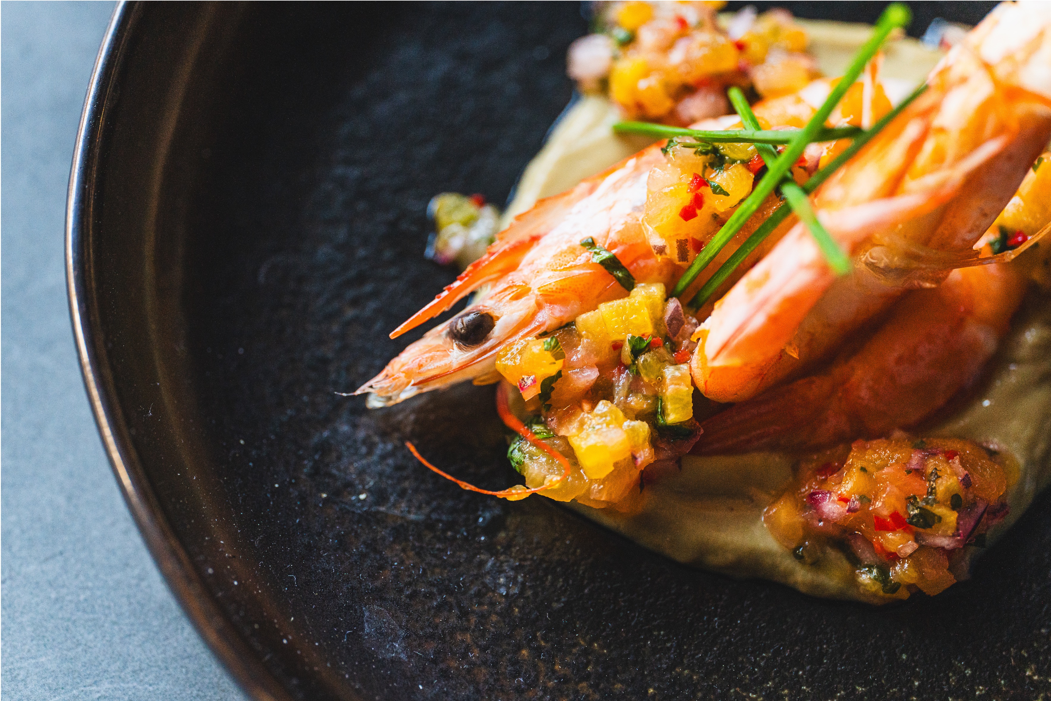 Grilled tiger prawns, mango & pineapple salsa, avocado